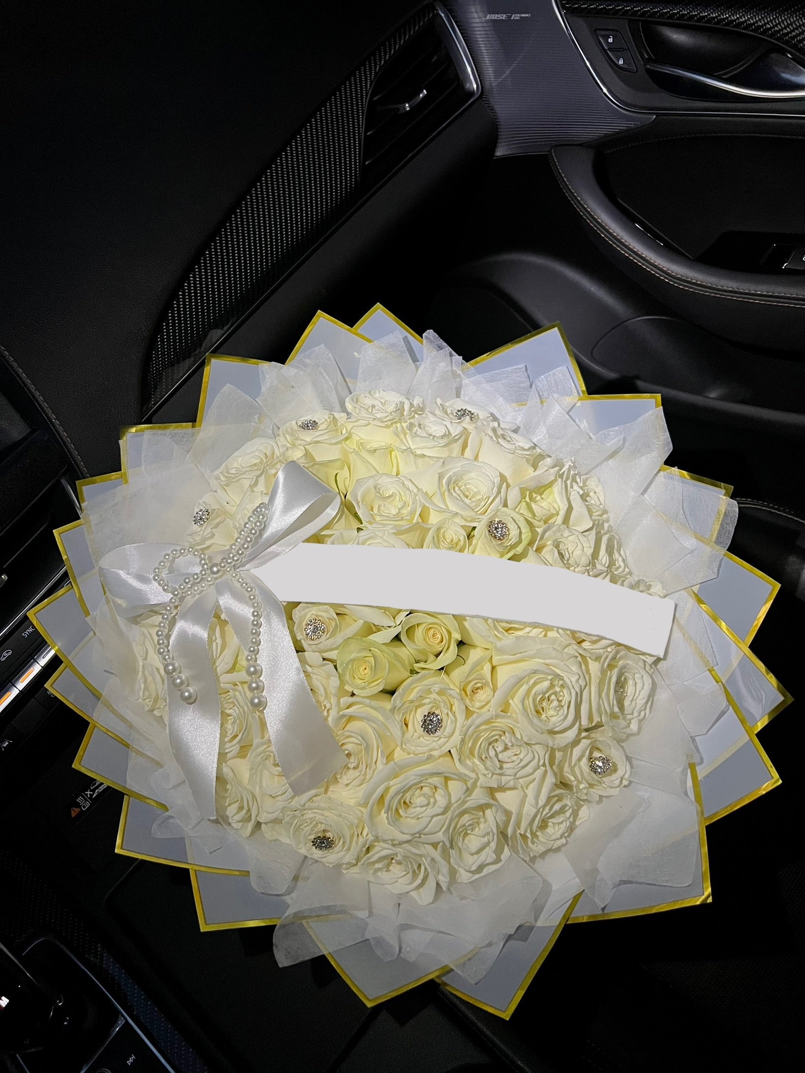 This beautiful 50 white roses bouquet is the perfect gift for any Occasion bride to be, wedding proposal or just because you want to express your love and appreciation for that special someone! Comes wrapped in our white and gold waterproof Korean wrapping paper, with a white bow, and diamond pins. Our florists select the freshest flowers available, so shade of rose may vary due to local availability.